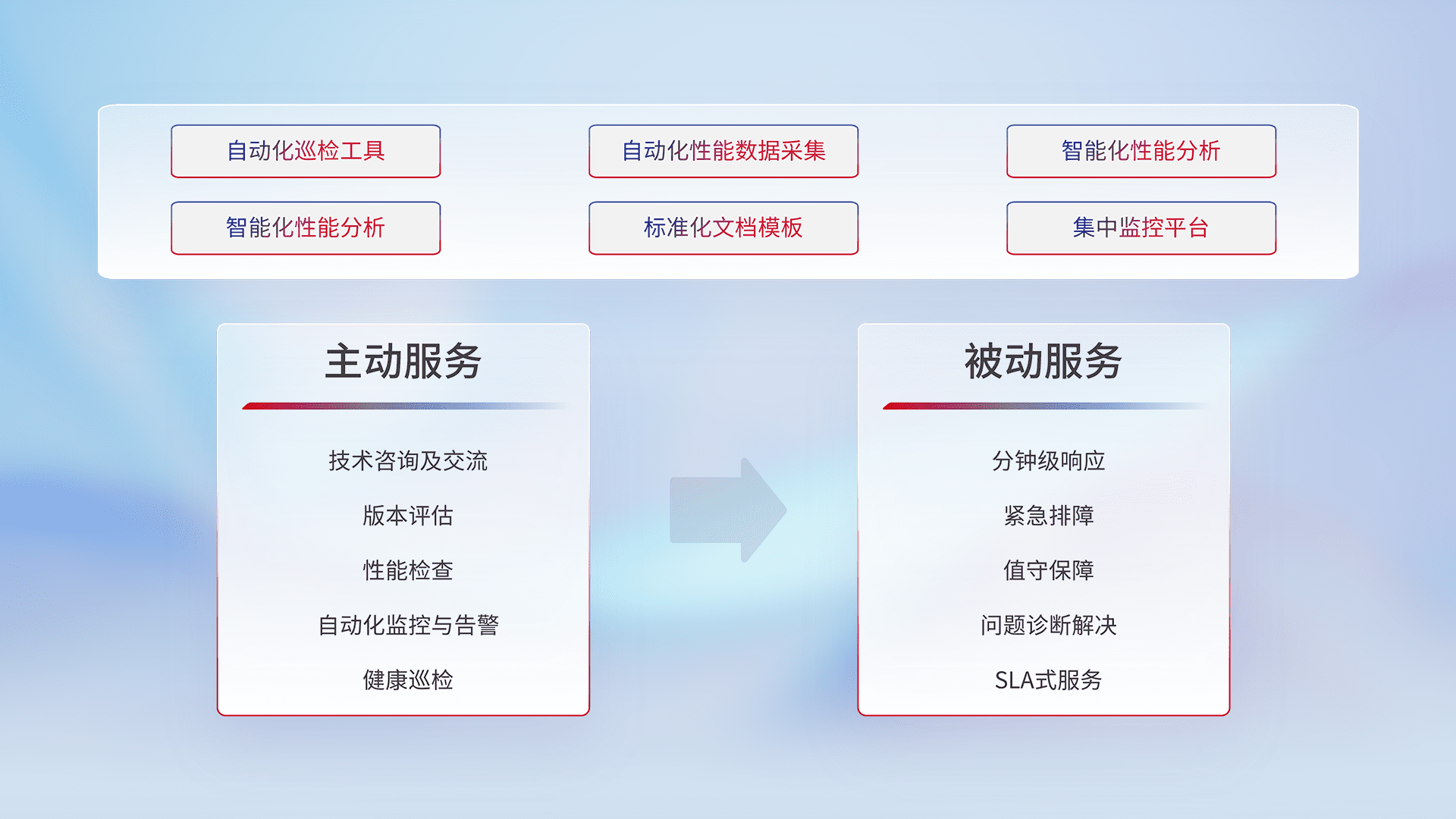 智能化工具和标准化文档,,保障服务质量,,,,提供主动服务(包含技术咨询、、、、版本评估、、、性能检查、、自动化监控与告警、、、、健康巡检)和被动服务包含(分钟级响应、、、紧急排障、、值守保障、、、问题诊断解决、、、SLA服务)。。。。