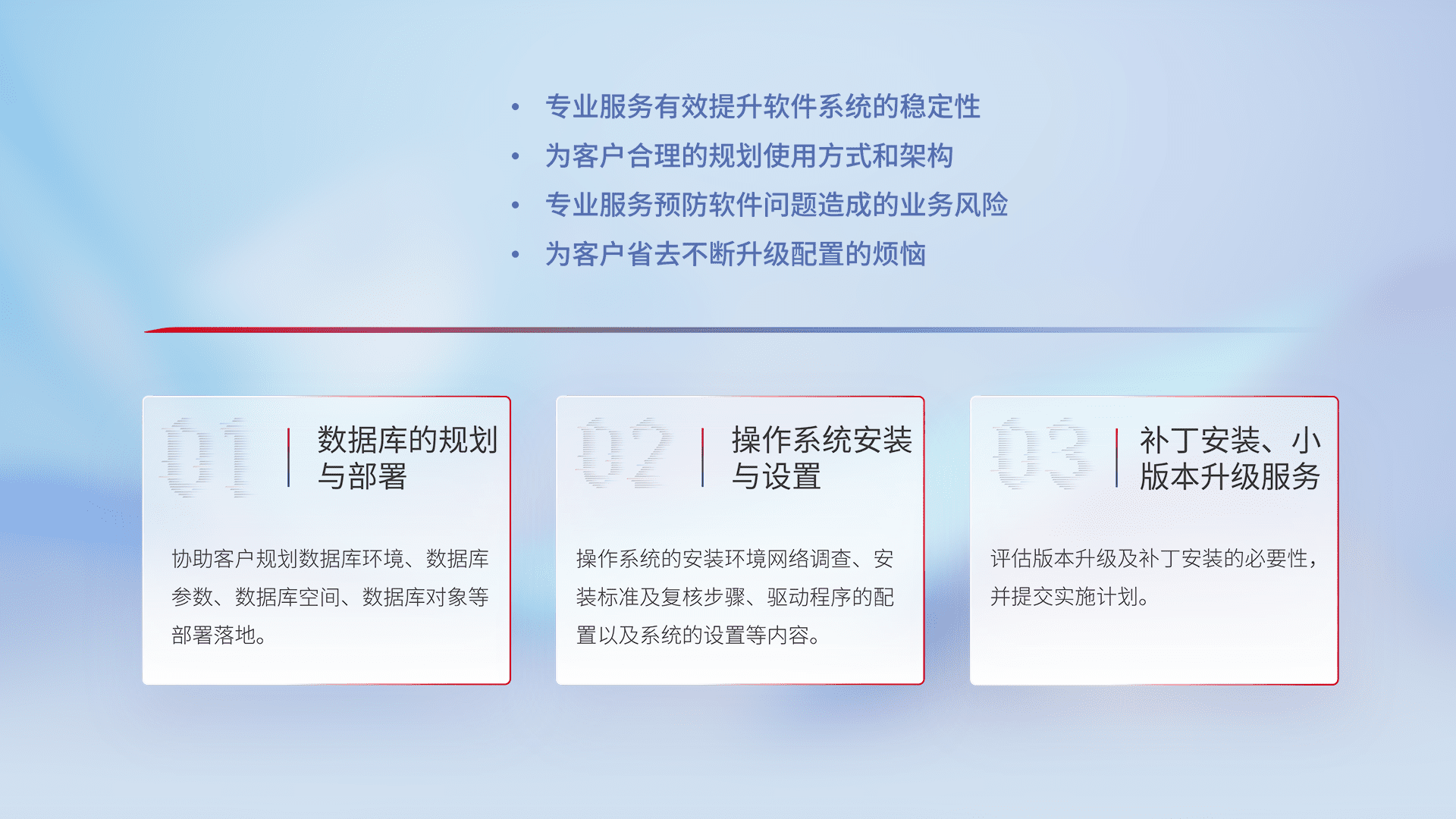 为客户提供软件规模升级、、、、快速部署、、按需配置的专业服务,,从数据库的规划与部署到操作系统的安装与设置,,,,再到补丁安装和小版本升级提供支持。。。。