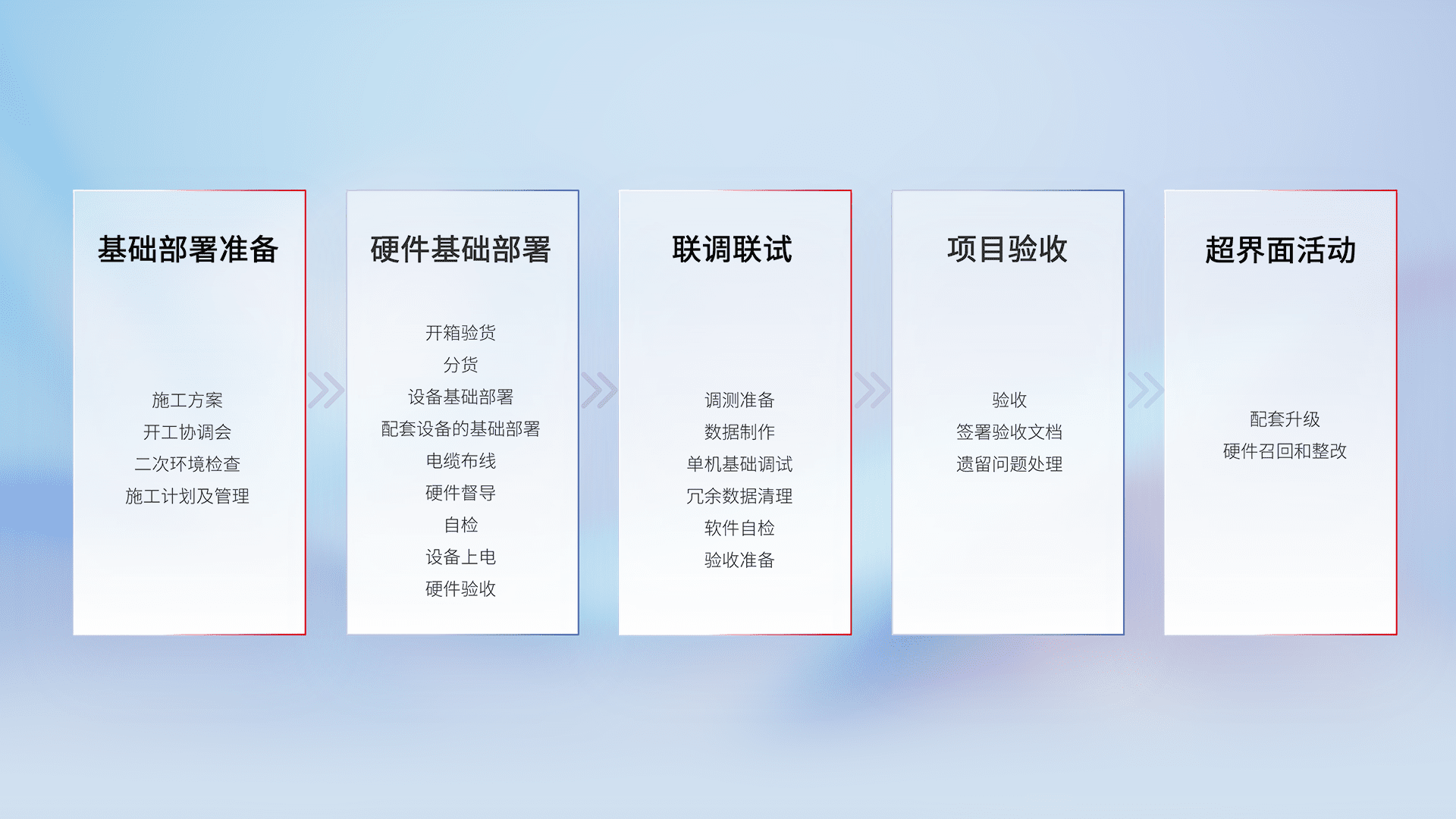 从基础部署准备、、、硬件基础部署、、、联调联试、、、、项目验收、、越界面活动的全过程可追溯,,,,保证施工质量和进度。。